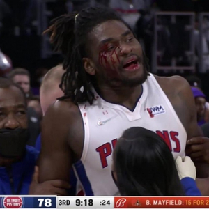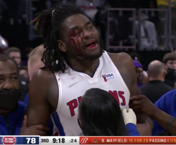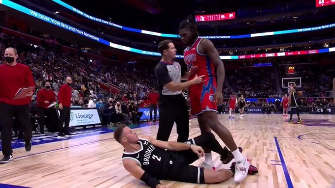 斯图尔特被打破眼角后,他起身找詹姆斯对质被拉住,又两次挣扎出队友、裁判、安保的包围,想要突围去找湖人队队员对质,最后被劝离场。