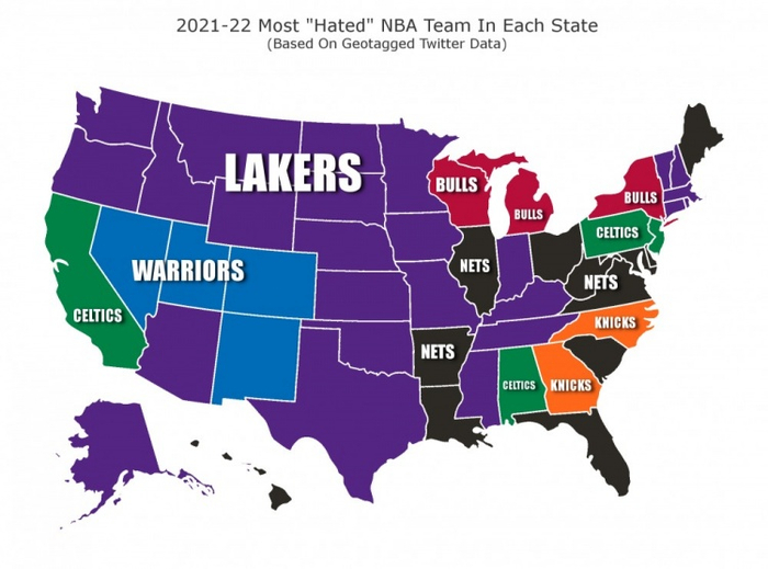 美国各州最讨厌的NBA球队:湖人居首 篮网&勇士紧随其后
