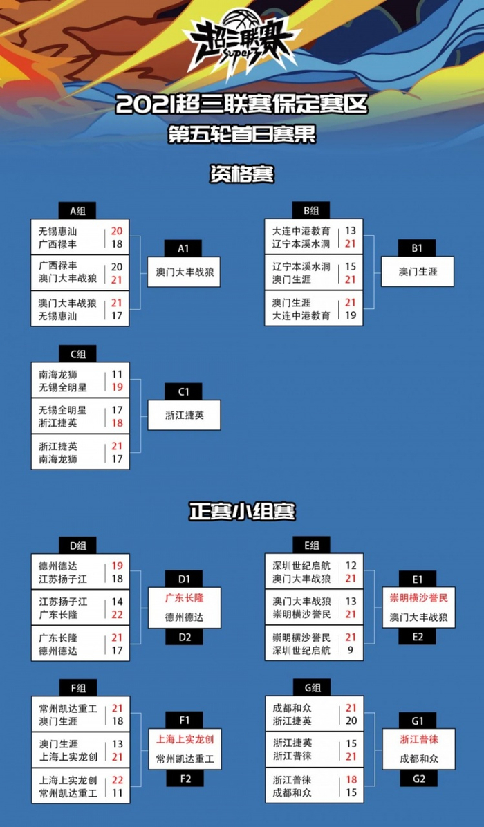 伴随着浙江普徕王潼的暴扣,2021 超三联赛保定赛区第五阶段首日比赛全部结束,广东长隆、崇明横沙誉民、上海上实龙创、浙江普徕分别全胜晋级,以小组头名的身份,静候明日比赛。