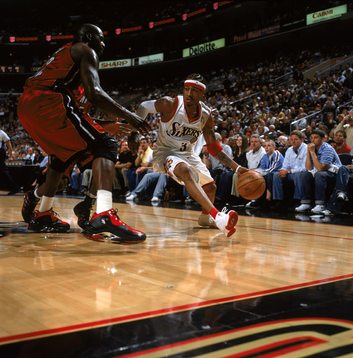 每一次艾弗森突破重围杀进篮下,他都要面对庞大的沙奎尔-奥尼尔,每一次他起跳上篮时都会被奥尼尔凌空拍下,摔在地板上。