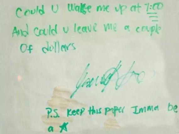 熟悉哈登的朋友肯定都记得,哈登在12岁给他母亲留的那张纸条:“你能7点叫我起床吗?能给我留点钱吗?PS,留着这张纸,我将会成为一个巨星。”