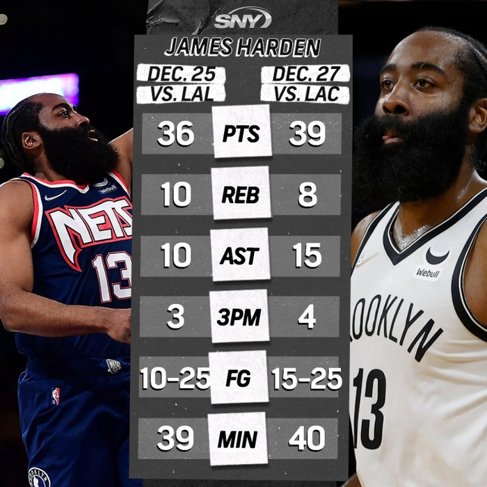 12月14日,哈登触发了联盟的健康与安全条例。之后的几天篮网有多达6人接连触发条例,球队也因为人员不足推迟了两场同奇才队和开拓者队的常规赛。联盟办公室估计天天烧香拜佛求篮网能凑够人员打和湖人的年终大战,结果杜兰特还是没能火线复出。幸亏哈登如期而至,才没让湖人和篮网的圣诞大战沦为詹姆斯的独角戏。