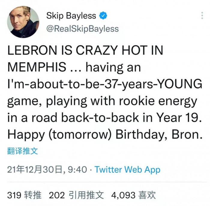 尽管最后时刻输掉比赛,詹姆斯还是交出了37分13板7助攻2抢断2封盖的全面数据。就连黑了詹姆斯快20年的美国头号詹黑Skip Bayless也发推说:“快37岁的詹姆斯在孟菲斯手热到发烫,在第19年像个新秀一样在客场背靠背的比赛中能量十足。明天生日快乐,詹姆斯。”