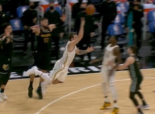 时间只剩最后1.4秒,当所有人都认为比赛要进入加时时,鹈鹕后卫格兰汉姆后场接球,在距离篮筐61英尺的位置扔出超远三分,打板压哨命中,杀死比赛!