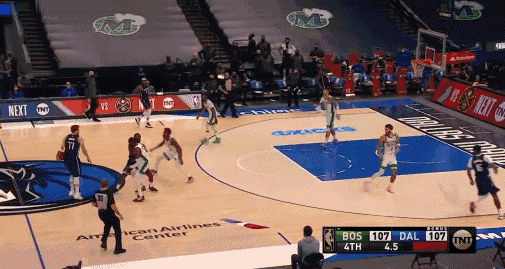 2月24日常规赛,在东契奇面对泰斯的后撤步三分与杰伦-布朗打进的上篮后,终场前9.5秒,独行侠与绿军战成107平。