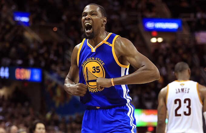 4、2017年6月8日,勇士118-113战胜骑士,总决赛大比分3-0领先。杜兰特出战41分钟,得到31分9篮板4助攻。比赛最后75秒,杜兰特包揽勇士全部7分。终场前45秒,阿杜命中了26尺的超远反超三分,这是他职业生涯标志性的时刻。