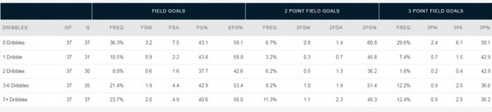 对于库里而言,作为这支球队的头牌,在阻击战中无法亮出耀眼的数据,的确应该承担一些责任。可面对重重阻击和长臂防守,库里或许可以改变一些打法,更多选择无球进攻。数据显示,本赛季当库里只运1-2次球投三分时,他的外线命中率为42.9%(效率最高)。当库里不运球时,他的整体命中率为43.1%(效率最高)。所以库里的打法如果能做一些变通,对勇士破局或许会有很大帮助。