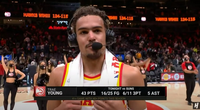 此役,特雷-杨出场35分钟,25投16中,三分球11中6,得到43分5助攻。