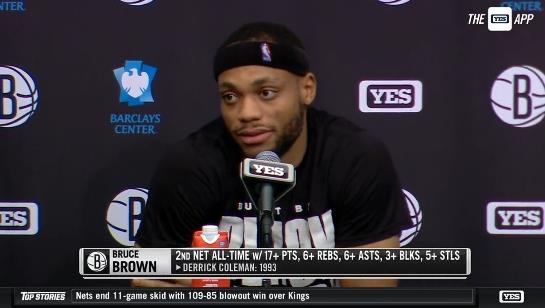 直播吧2月15日讯 篮网今日轻取国王结束11连败,赛后布鲁斯-布朗接受了采访。