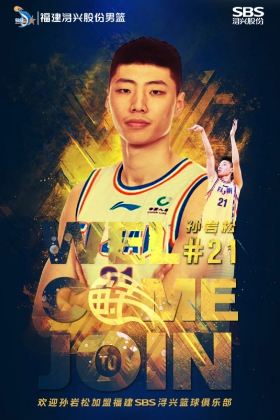 福建男篮官方写道:“欢迎孙岩松加入福建浔兴股份男篮大家庭!希望他能够迅速融入主队;在不断提高自己竞技状态和水平的同时,助力主队取得更好的战绩。”