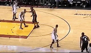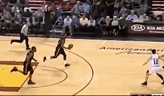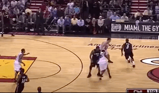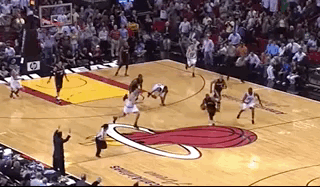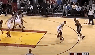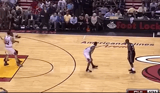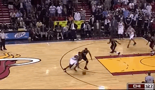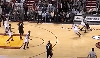 这回合可以说是韦德最标志性的一球,在挡拆上提的瞬间,体前变向,面对补防的内线球员,再次换手变向,钻过协防的空隙杀入篮下。韦德在这一场比赛中,就搏得了18次罚球。