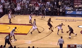 在第二个加时,韦德故技重施,加速突破、两次变向,让四名公牛防守人都只能吃到闪电侠飞驰而过的尾气。