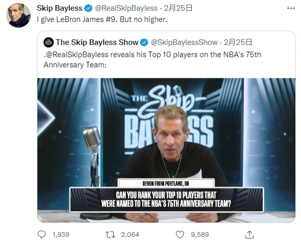 昨日,名嘴Skip Bayless也被球迷问及“是否能在官方75大名单中排出Top10”,Skip Bayless也给出了自己的选择:
