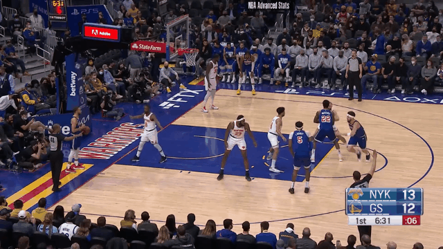 这一次是维金斯在外线持球,普尔是第一道掩护,而克莱是第二道。勇士自己也知道维金斯不可能被包夹,所以他们用两位有得分威胁的球员做掩护来混淆视听。