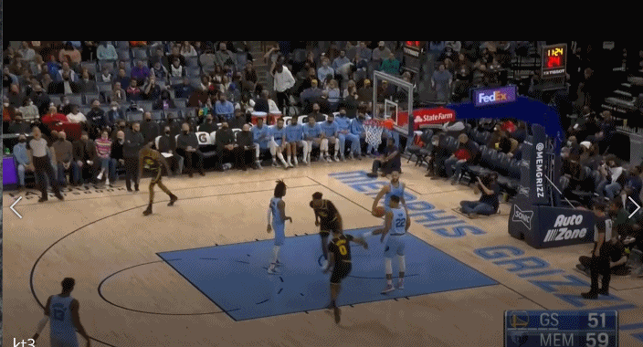和上面不同的是,灰熊这边没有连续进行换防,扎伊尔-威廉姆斯而是直接追着库里,莫兰特也选择去追库里,让他们队内最好的防守者小贾伦-杰克逊面对卢尼和克莱。但杰克逊反应很快,直接绕过卢尼的掩护,不过克莱调整了一下脚步,依旧命中了三分。
