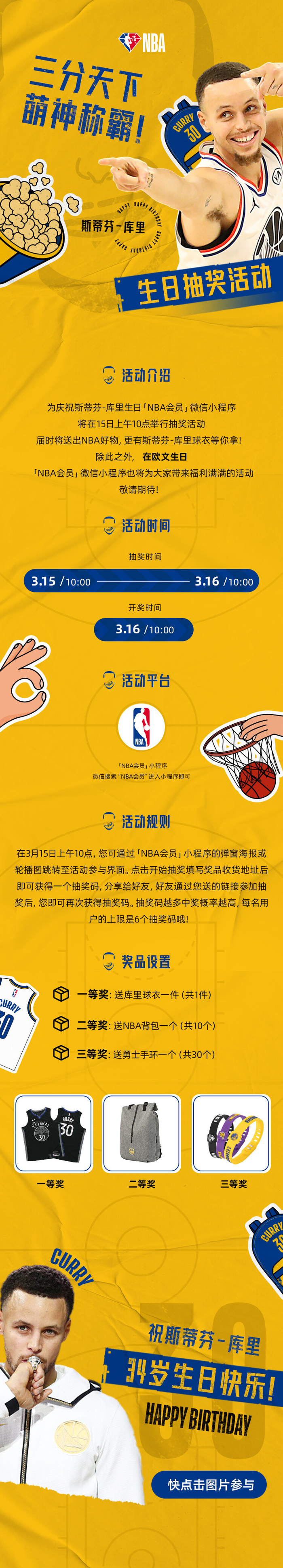 当此时日,为了庆祝库里34岁生日,【NBA会员微信小程序】现在正在举行「三分天下,萌神称霸!」斯蒂芬-库里生日抽奖活动,我们为大家准备了库里球衣等精美礼品!