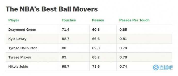 这一点有数据支持。尽管他不是直接助攻的人,他会做出各种各样的传球来创造空位出手机会。当格林在场时,勇士的助攻率为72.4%(他们轮换中所有球员最好的),当他不在场时,这一数字下降到的65%(最差)。本赛季至少上场400分钟的非勇士球员都没有超过70%。
