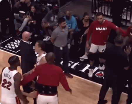 球迷:点亮这条评论。看起来巴特勒跟斯波说“别像个碧池一样威胁我。”斯波说,“你觉得我要跟你干架吗?”于此同时,哈斯勒姆说,“给他们看看!给他们看看。(指对面勇士队)我们TM不是你敌人。我们不是敌人。”接着巴特勒站了起来,看起来好像要把哈队打得满地找牙(可能这个时候说了“CNM”?)。