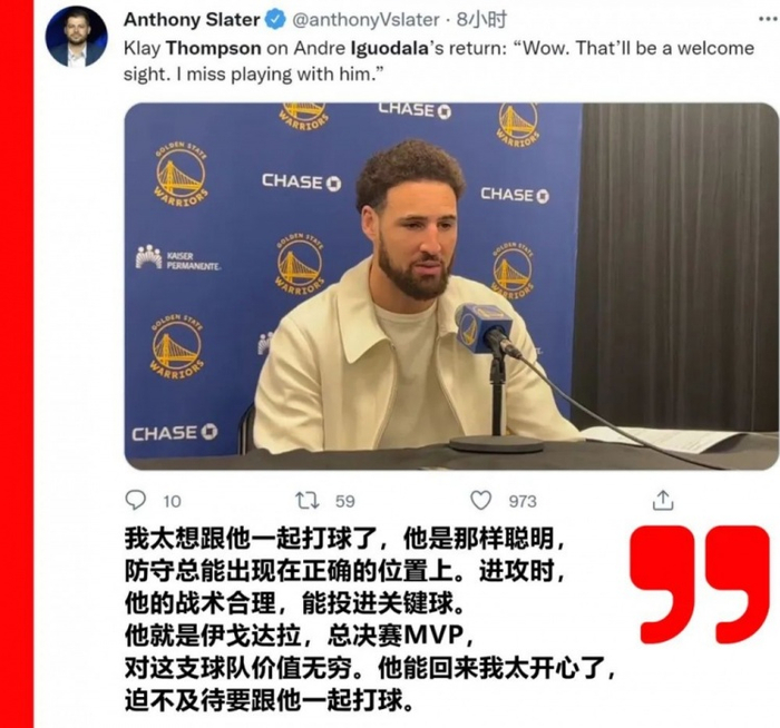 伊戈达拉准备回来打季后赛了,他在的时候,勇士才可以在两套阵容里面都有格林式的弧顶支配球方式,汤普森为此大赞伊戈的厉害,一个形容词都没剩下。
