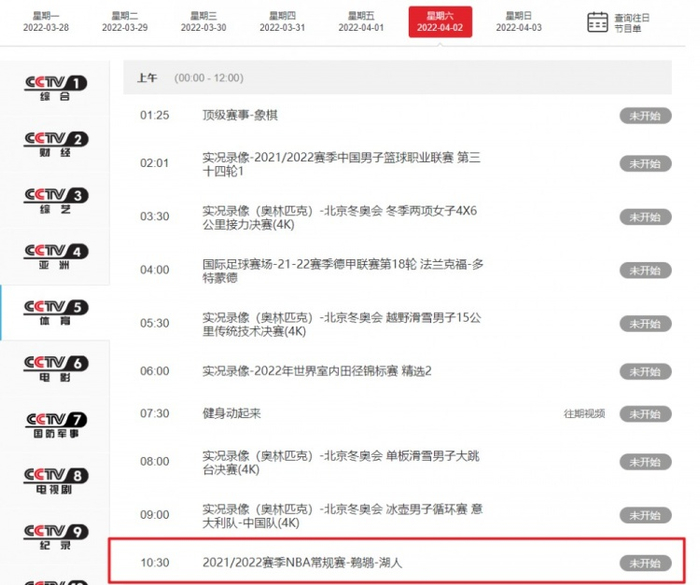 直播吧4月1日讯 据最新央视网节目单,中央五套(CCTV5)将于明早直播鹈鹕对阵湖人的NBA比赛。