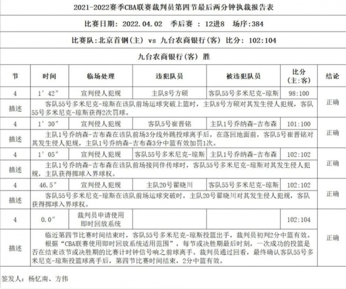 直播吧4月3日讯 昨日CBA季后赛12进8,北京遭绝杀102-104不敌吉林。CBA官方今日出具了本场比赛第四节最后两分钟的裁判报告。报告显示最后两分钟的所有判罚均正确,琼斯的绝杀没有超时。
