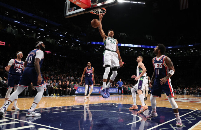 雄鹿对阵篮网的比赛中,篮网外线手感极佳。篮网全队三分球37投18中,投出了48.6的超高命中率。但是面对内线薄弱的篮网,字母哥大发神威。他全场21投14中,罚篮19罚15中,砍下44分14篮板6助攻。当德拉蒙德不在场时,字母哥经常直线加速突到篮下扣篮,即使篮网四人回收篮下也拦不住字母哥的冲击。在这场最终分差只有1分的比赛里,字母哥的正负值达到了+12,是双方所有球员里唯一一个正负值上双的,其比赛影响力可见一斑。在这场比赛中,字母哥在雄鹿队的总得分超过贾巴尔,成为了雄鹿队史得分第一。
