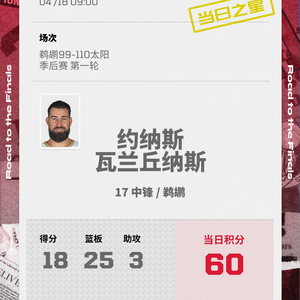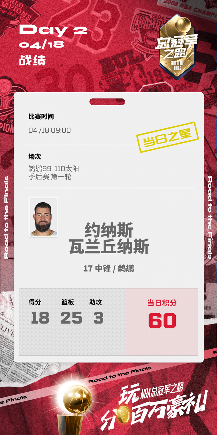 约纳斯-瓦兰丘纳斯在今日的比赛中得到18分25篮板3助攻,数值总和达到60分,当选今日“NBA总冠军之路”的当日之星。参与“NBA总冠军之路”,体验竞猜乐趣,瓜分百万豪礼。