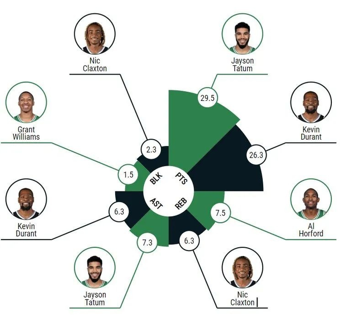 塔图姆和杰伦-布朗拥有非常强壮的身体,但他们是核心,还要肩负得分重任,所以防杜兰特的任务每个人都干过:从斯马特开始,塔图姆接班,然后是杰伦-布朗,换防时有霍福德、泰斯,等于5名首发轮流一遍;进入替补阶段,罗伯特-威廉姆斯、格兰特-威廉姆斯和怀特更要干脏活。