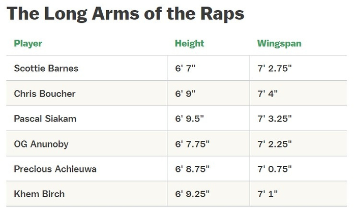 记者Kyle Mann在文章中分析猛龙队的防守优势时提到,猛龙阵中共有6名球员的臂展达到7英尺以上。以下为具体数据(身高未按表中数据换算,均按直播吧数据):