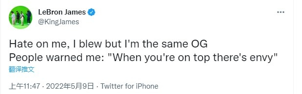 直播吧5月9日讯 今日,湖人球星詹姆斯更新个人推特晒出了美国嘻哈歌手Nas的名曲《Hate me Now》中的一句歌词: