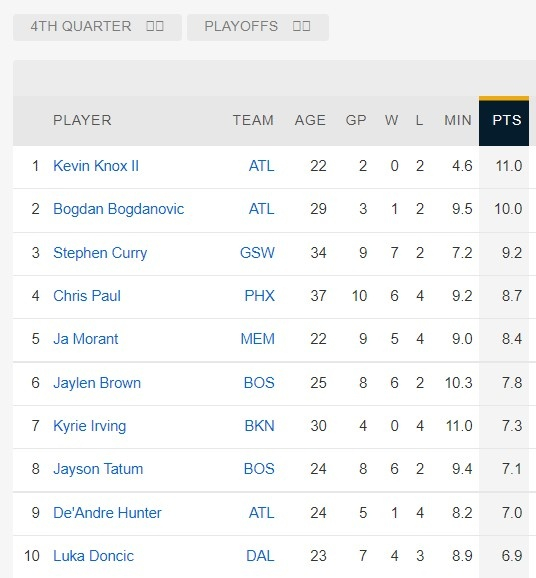 根据数据统计,库里是季后赛至今所有还在进行系列赛的球员中末节场均得分最高的——第四节场均7.2分钟他能砍下9.2分,比第二名的保罗少用2分钟多拿0.5分;