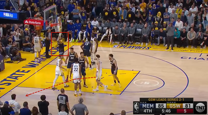 当然,战术的重中之重是远端克莱-汤普森、普尔、维金斯三人的站位。普尔和维金斯两人并排,为“关门”做准备。克莱则是看着库里,随时准备启动,跑动到既定的底角位置接球。可以说,这是勇士的经典战术,机智的灰熊球员狄龙-布鲁克斯通过勇士的站位识破了战术,抬手示意队友要注意底角的位置。遗憾的是德斯蒙德-贝恩和凯尔-安德森都背朝狄龙-布鲁克斯,琼斯则是半低头紧盯克莱,三人都没有看到狄龙-布鲁克斯的提醒。