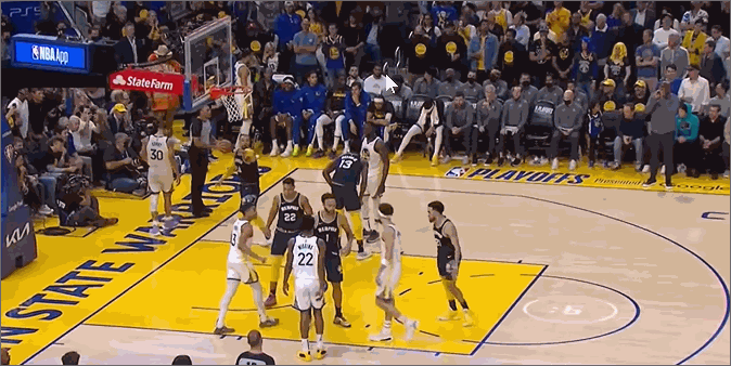 在库里从裁判手中接过球的霎那,克莱从普尔和维金斯两人中间穿过,接着普尔、维金斯交叉掩护,挡住防守人,完成“电梯关门”。当琼斯反应过来后已经稍晚了一刻,克莱在底角顺利接到球,稳稳三分命中。