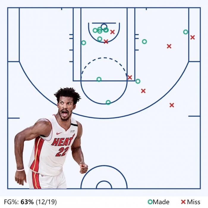 这一战巴特勒拿下41分,其中第三节独取17分,有9分来自罚球,全场罚球18中17。前两轮巴特勒虽然投了44个三分,但他本质上不喜欢远投,东决第一战也没有投中,全部得分除了罚球,大多来自中投和上篮,其中7个球在三秒区内(包括一次反击扣篮)。