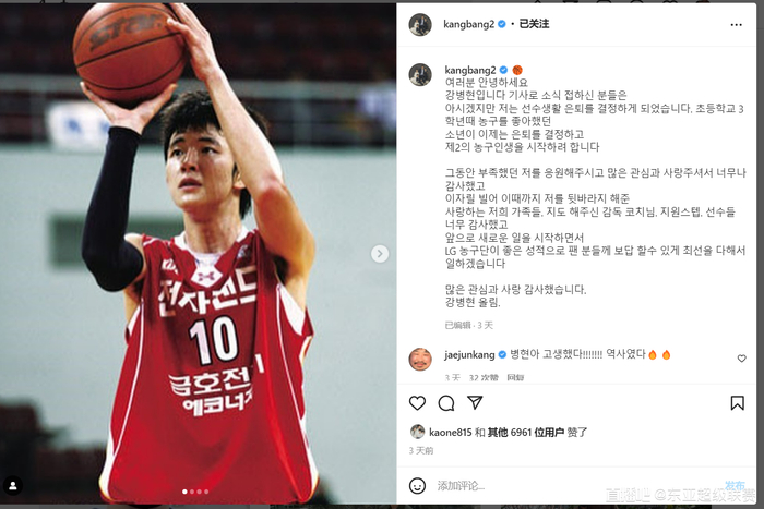 一名效力于昌原LG猎隼俱乐部的KBL球员,他的名字叫姜炳贤,几天前宣布退役了,正式结束其14年的职业生涯;退役后,他将以分析师和球探的身份继续留在俱乐部工作。
