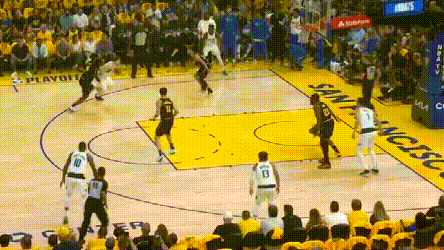 独行侠的轮转很容易漏的区域是中距离,继续进中投对勇士很有意义。但勇士更希望的,自然是篮下和三分线的优质机会。独行侠对三分线的防守很严密,也不出所料的夹击了库里,而勇士也很快给出了回应——库里跟内线、锋线的交叉掩护,跑起来。