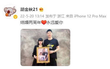 胡金秋晒出一张和妻子王璐的合照,并写道:“结婚两周年,永远爱你。”