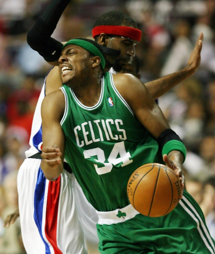 2007-08赛季,在三巨头带领下,绿军时隔20多年又向总冠军发起冲击,而他们在东决的对手是老辣的活塞。G1,加内特和皮尔斯携手拿下48分,绿军先拔头筹;G2尽管三巨头都得分20+,6人上双的活塞却从波士顿凯旋。