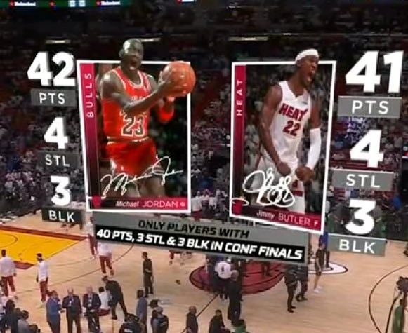 G2赛前,转播方给到了巴特勒在G1达成的一项里程碑。他单场砍下41分4抢断3盖帽,成为自乔丹(42分4抢断3盖帽)以后,首位在东部决赛单场砍下至少40分3抢断3盖帽的球员。