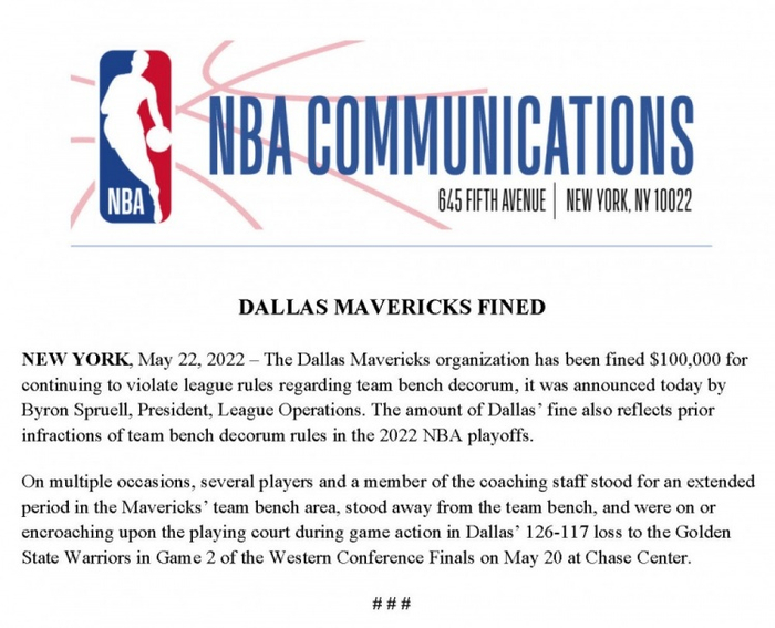 直播吧5月23日讯 今日,NBA官方宣布,独行侠因违反联盟替补席礼仪规定,处以10万美元的罚款。