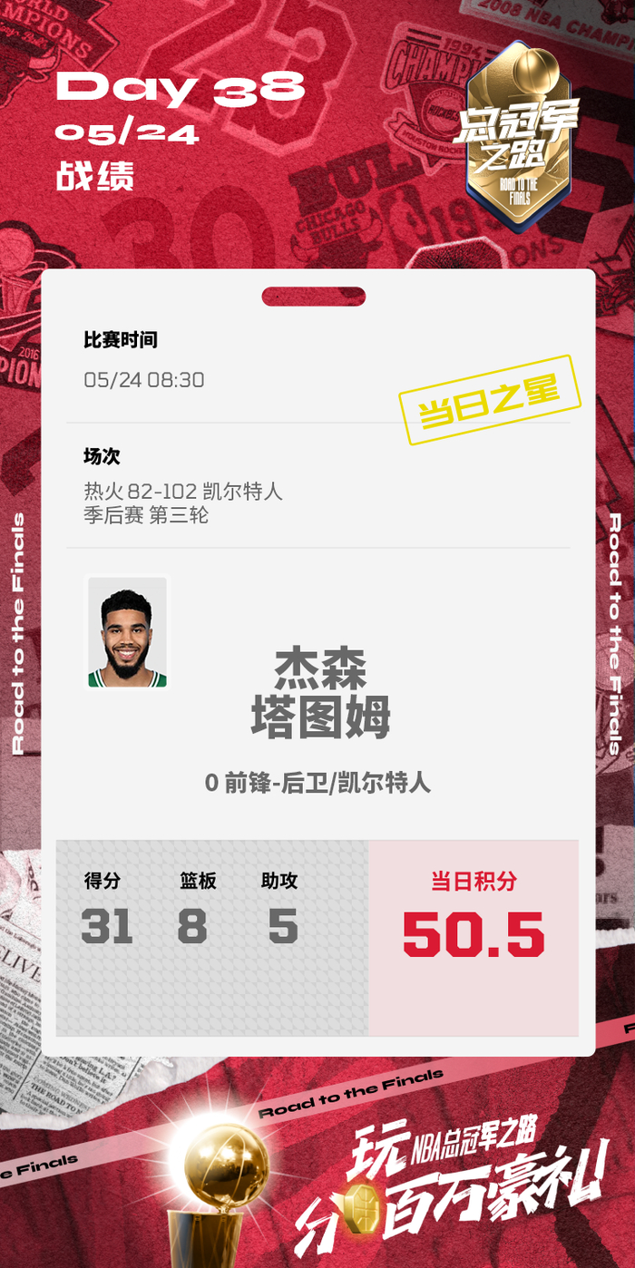 杰森-塔图姆在今天的比赛中得到31分8篮板5助攻,总分50.5分,当选“NBA总冠军之路”当日之星。参与“NBA总冠军之路”,体验竞猜乐趣,瓜分百万豪礼。