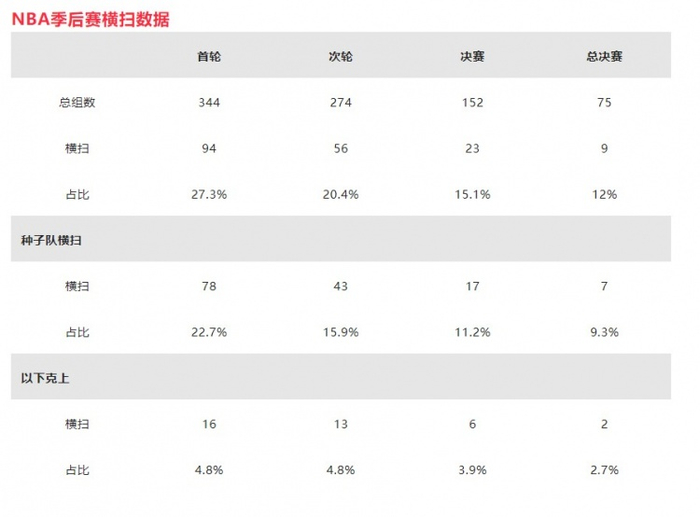 细分这些系列赛,首轮横扫占比最高,超过27%,总决赛最低,只有9次,占比12%,最近的一次是2018年勇士横扫骑士。这样分布也有道理,因为首轮实力差距大,横扫可能性也大,总决赛实力最接近。因此,横扫占比也是随着不断晋级而下降。