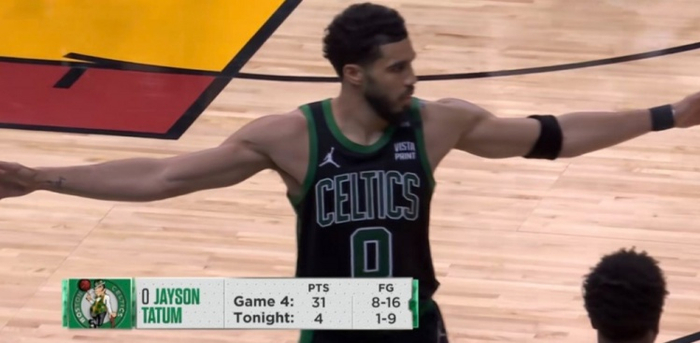 你可以看到,上半场9中1的塔图姆,第三节4投3中外加4次罚球合计笑纳9分,没有了夹击,摆出一对一,那防守不就是给塔图姆当菜吃?