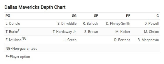 控卫:东契奇,伯克,尼利基纳;分位:丁威迪,小哈达威,约什-格林;小前锋:布洛克,斯特林-布朗;大前锋:芬尼-史密斯,克莱伯,贝尔坦斯;中锋:鲍威尔,克里斯,博班。