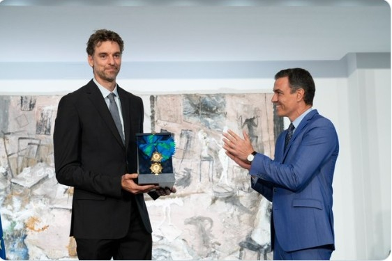 直播吧6月2日讯 前NBA球员保罗-加索尔今日从西班牙首相佩德罗-桑切斯手中接过象征西班牙体育界最高荣誉的皇家大十字体育勋章。