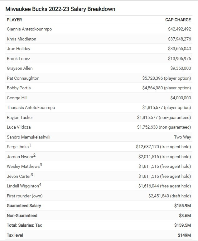 雄鹿队2022-23赛季的工资单