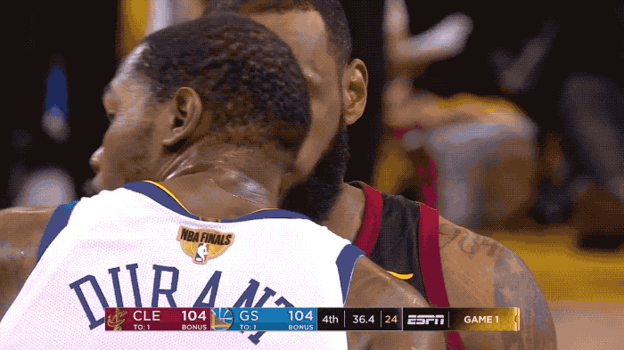 决胜时刻,双方比分始终焦灼。比赛最后50秒,詹姆斯弧顶持球点名库里,在杀入禁区后面对鲁尼的补防空中对抗打进,并造成加罚。比赛最后32秒,詹姆斯突然加速过掉杜兰特,直杀篮下再取2分,率队成功实现反超。