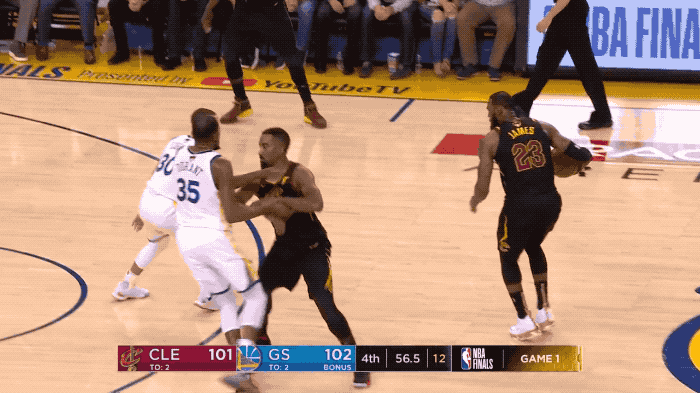 带着6分劣势进入末节,詹姆斯助攻杰夫-格林和科沃尔连续命中三分,将分差瞬间缩小到1分。而当勇士再度拉开比分至6分时,又是詹姆斯挺身而出,不断冲击勇士的防线。他先是直杀禁区反手上篮,接着面对杜兰特的补防单手暴扣,一人在场上冲锋陷阵连砍4分。
