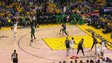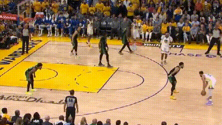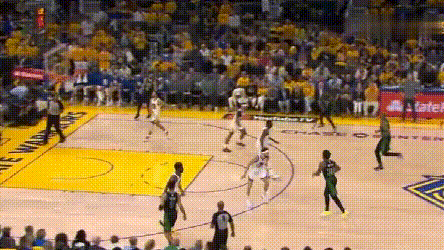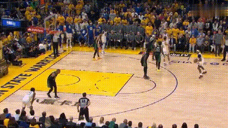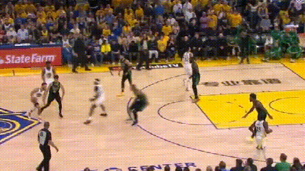 这个对位在下半场调整了,改为塔图姆防追梦,罗威防波特,霍福德防维金斯,于是勇士进攻立刻便秘。凯尔特人第三节反超比分,除了三分开壶之外,这组对位调整的作用也不容忽视。事实上,只要凯尔特人对位不出问题,在库里状态一般的时候,勇士阵地战打得很累。比如下面这个回合: