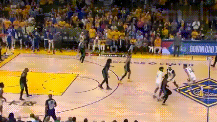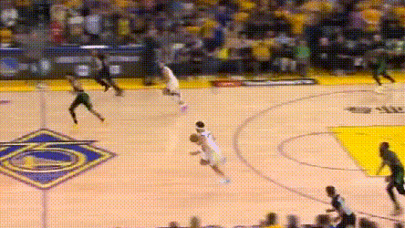 勇士Post Split起手,卢尼策应,库里借维金斯掩护三分线接球,霍福德上提干扰,凯尔特人上线防守呈夹击之势,库里出球,维金斯切入,空中闪躲入网,状元天赋尽显。